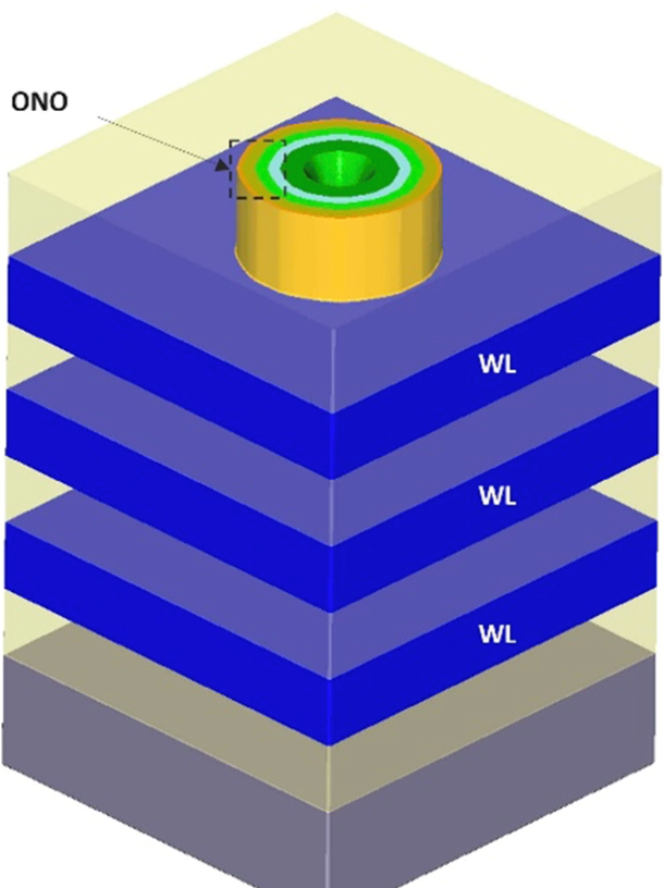 Figure 2: Schematic diagram of a three-dimensional NAND gate-all-around architecture, showing a series of vertically arranged charge trap cells, using an oxide-nitride-oxide (ONO) gate dielectric, and a limited number of word lines.