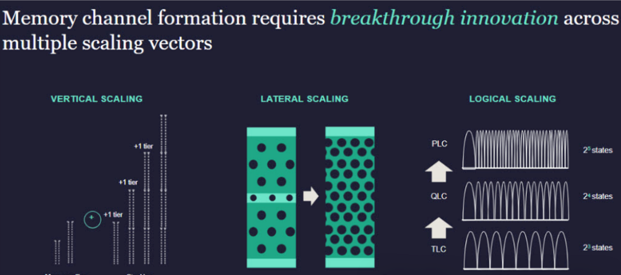 Figure 1: NAND flash memory achieves scaling by reducing cell pitch and size, stacking word lines, and increasing the number of bits per cell.