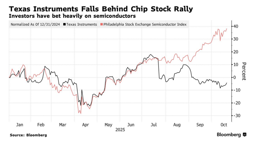 Texas Instruments' stock, which has lagged the broader semiconductor market this year, fell about 8% in after-hours trading.