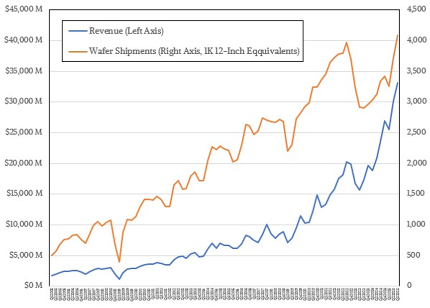 TSMC's business is growing in two ways. First, wafers are becoming richer (more features packed onto smaller transistors), allowing TSMC to charge higher fees for etching them.