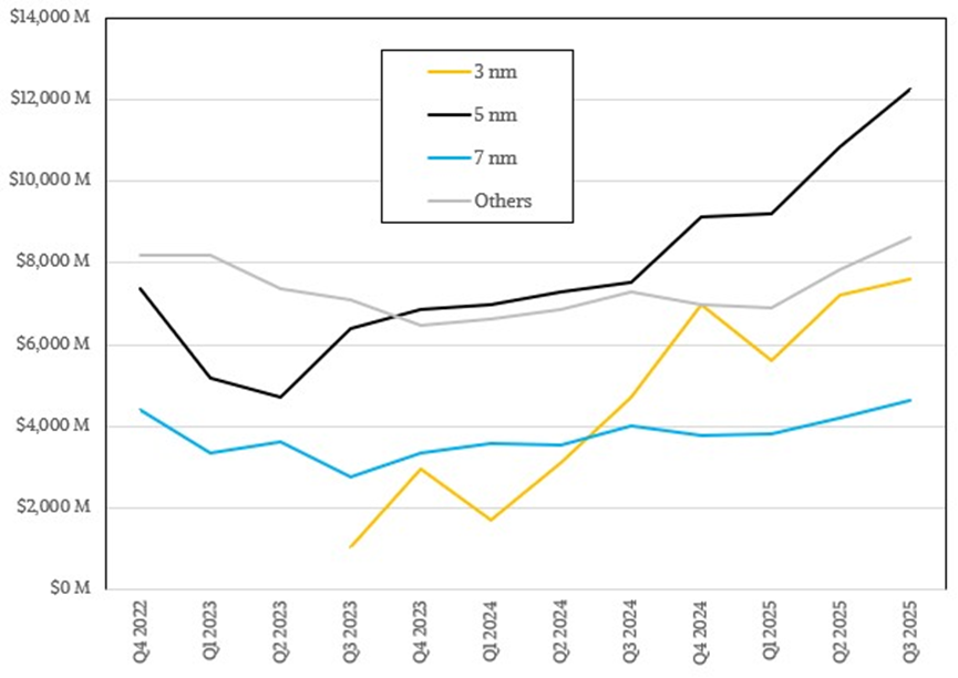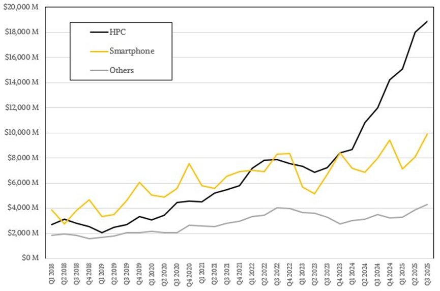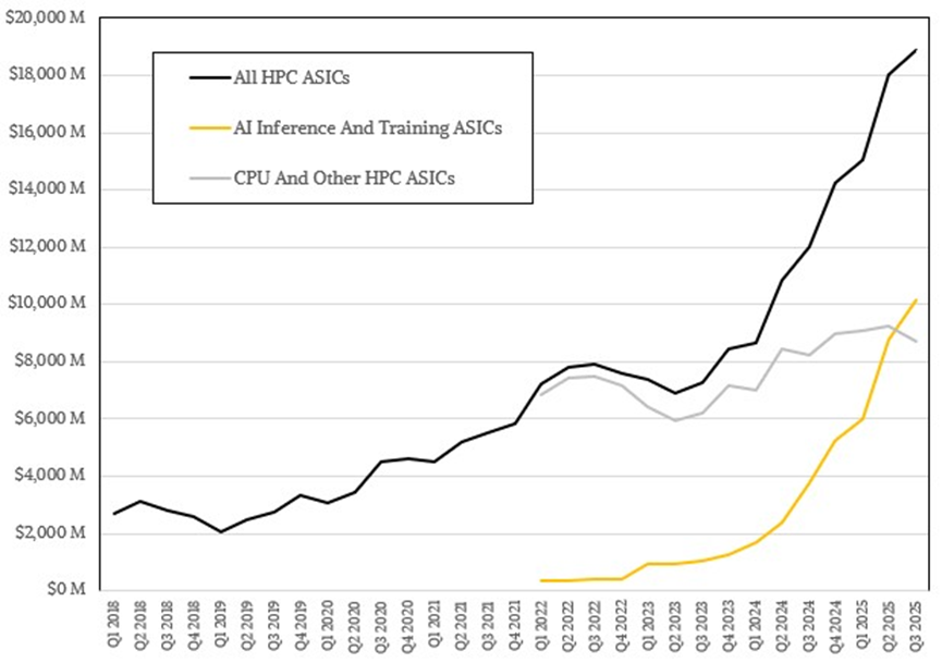 In the third quarter of 2025, sales in the high-performance computing (HPC) category (again, this is not the HPC we discuss on The Next Platform) reached $18.87 billion, a year-over-year increase of 57.4% and a quarter-over-quarter increase of 4.6%. According to our model, AI inference and training chips account for 53.9% of TSMC's HPC division sales in the third quarter of 2025, a 2.7-fold year-over-year increase to $10.16 billion.